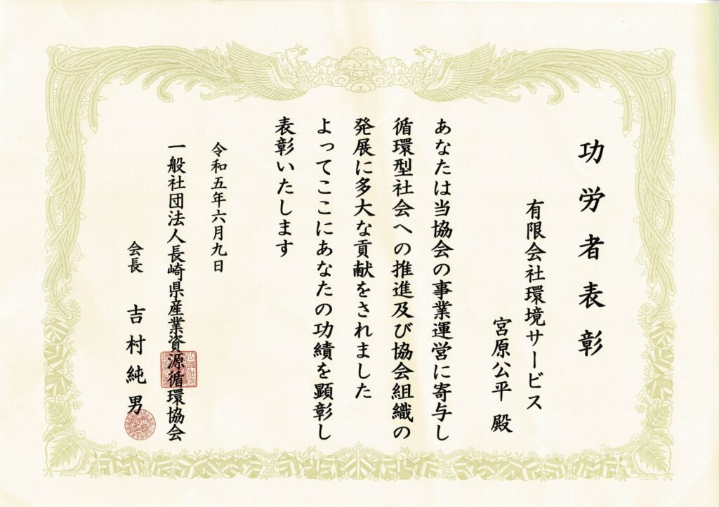 一般社団法人 長崎県産業資源循環協会様より表彰して頂きました。